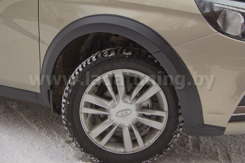 Cross-комплект состоит из 10 деталей и устанавливается на колёсные арки, а также пороги автомобиля. Монтаж изделий производится на заводские болты и двухсторонний скотч 3М. Чтобы правильно установить накладки, необходимо предварительно обезжирить предполагаемое место для установки и обработать поверхность праймером.